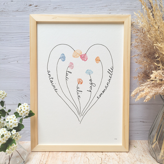 Quelques fleurs en transparence disposées en un cœur fin et délicat, accueillant les prénoms des membres de votre famille.