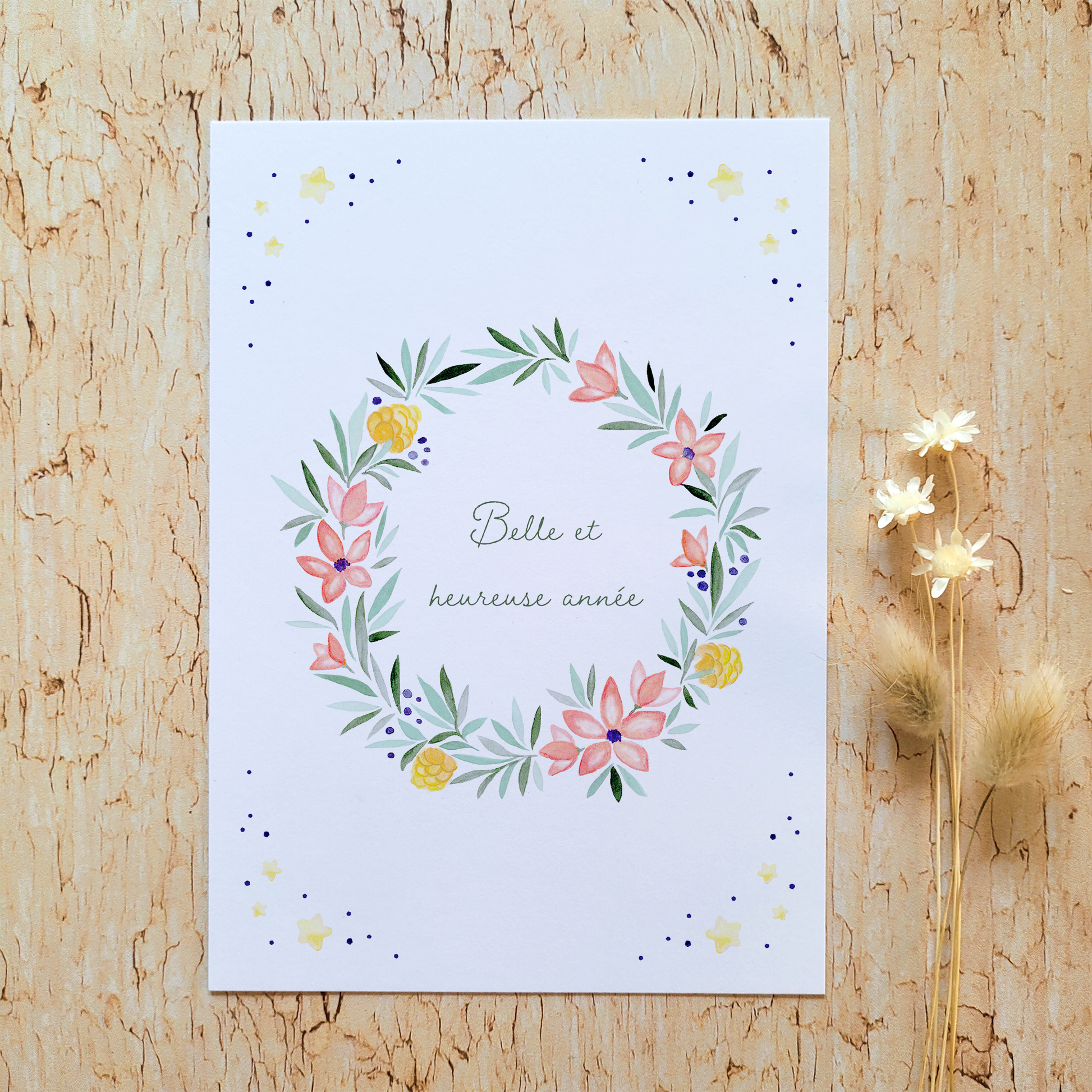Cartes de vœux, couronne fleurie et végétale "Belle et heureuse année".